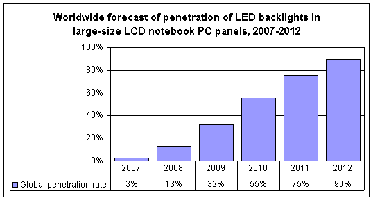 iSuppli estimates 90% of large-sized LCD notebook-PC panels shipped in 2012 will employ LEDs to backlight their displays, up from just 4.7% in the fourth quarter of 2007. By the end of 2008, LED-backlit large LCD notebook PC panel shipments will surge to 17.4 million units, up by more than a factor of six from 2.8 million units in 2007.