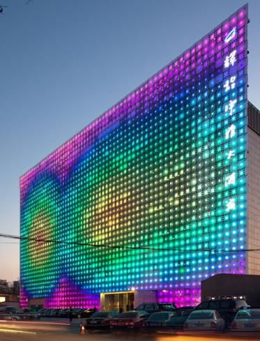 Say what you will about the fiascoes leading up to the Beijing Olympics, but the event has brought along with it some amazing new architecture. Greeting visitors attending the Xicui entertainment complex near the site of the games is a 20,000 square foot wall of computer-controlled LEDs, the largest of its kind ever built. Better yet, the wall manages to power itself completely using only the sun.