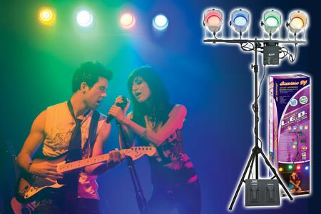 The American DJ LS-70 LED Par Can System includes four Par 38 polish Par Cans; four medium screw-base LED bulbs in red, green, blue and yellow; one T20F Chase Controller; and one LTS-6 Light Stand. The suggested retail price for the system is $469.95.