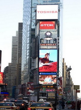 It’s reported that the Toshiba Vision Times Square display is bigger and offers higher resolution than the previously installed display that Toshiba took over in December 2007. Expressly designed for fixed outdoor installation at the Times Square site, the new display is a massive 15.6m x 16.0m (51.2 ft. x 52.5 ft.) and it incorporates a fully digital high-definition video system. The 22.3m (73.3 ft./880-inch) diagonal screen integrates an array of 1280 x 1248 LEDs, and high definition image quality is realized by Toshiba s proprietary TECHNOVIRTUAL technology. This innovative two-dimensional, pixel-sharing technology uses adjacent LEDs to create virtual pixels with a 12.5mm pitch. The Toshiba Vision Times Square display is designed to combine high definition image quality with environmental durability. It is also designed for enhanced eco efficiency, and uses the latest LED technology to cut power consumption, an advance that also contributes to improved performance reliability and an extended life cycle.
