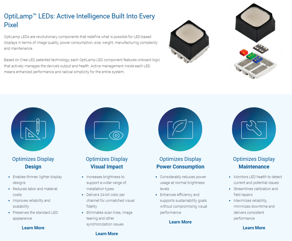 With this new OptiLamp technology, Cree LED sets a new standard for LED display performance, efficiency and system simplicity – unlocking next-generation designs and expanded application possibilities across the display industry.