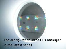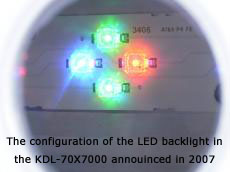Thanks to the LED devices that are densely mounted in each set, the RGB colors can be effectively mixed to emit white light with less unevenness. Estimating from the small and densely mounted packages, the heat generated by each LED device may be lower than that of the existing models. The heat value of each LED device presumably decreased because its luminance efficiency was improved. Alternatively, the package size and the distance between the packages may be reduced by slashing the power input to each device. Sony has not disclosed the number of LED devices used in the backlight or the input power per device.